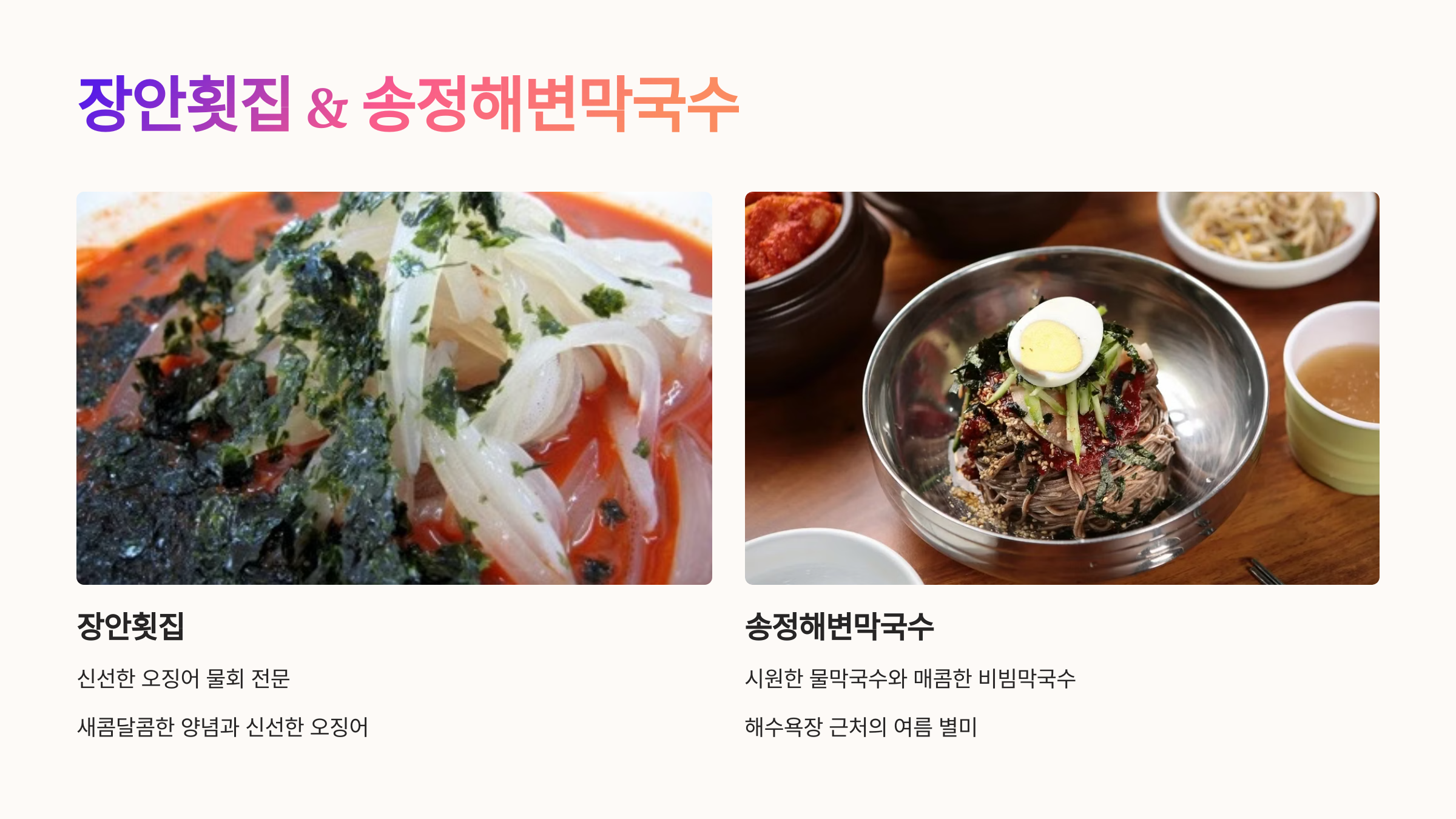 송정해수욕장 근처에 위치한 '송정해변막국수'는 시원한 물막국수와 매콤한 비빔막국수로 유명합니다. 메밀의 고소한 맛과 시원한 국물이 어우러져 여름철 별미로 사랑받고 있어요.