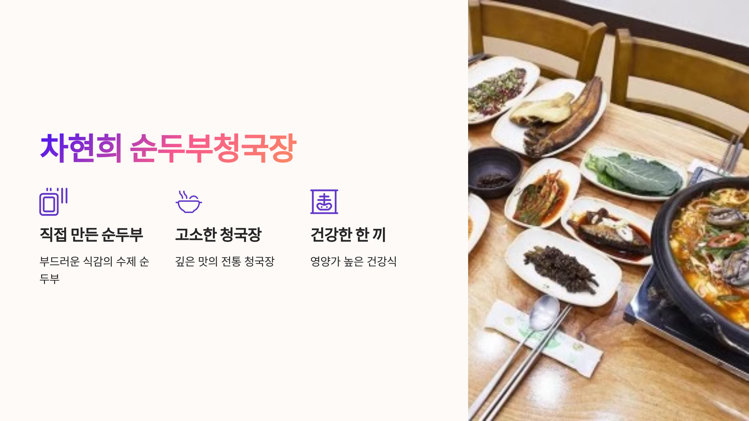 강릉 초당동의 '차현희 순두부청국장'은 직접 만든 순두부와 청국장으로 유명합니다. 고소하고 깊은 맛의 청국장과 부드러운 순두부는 건강한 한 끼 식사로 제격이에요.