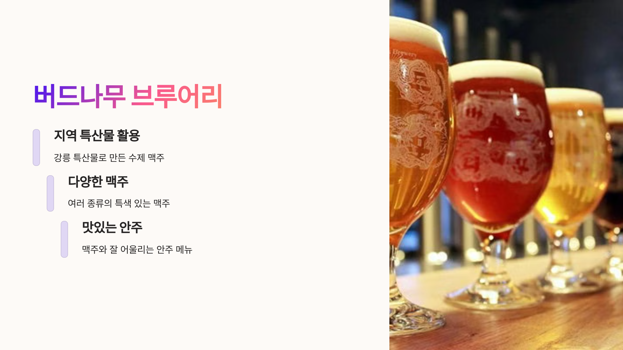 마지막으로 소개할 곳은 '버드나무 브루어리'입니다. 강릉의 지역 특산물을 활용한 수제 맥주를 즐길 수 있는 곳으로, 다양한 맥주와 함께 안주를 즐길 수 있어요. 맥주 애호가라면 꼭 방문해보세요.