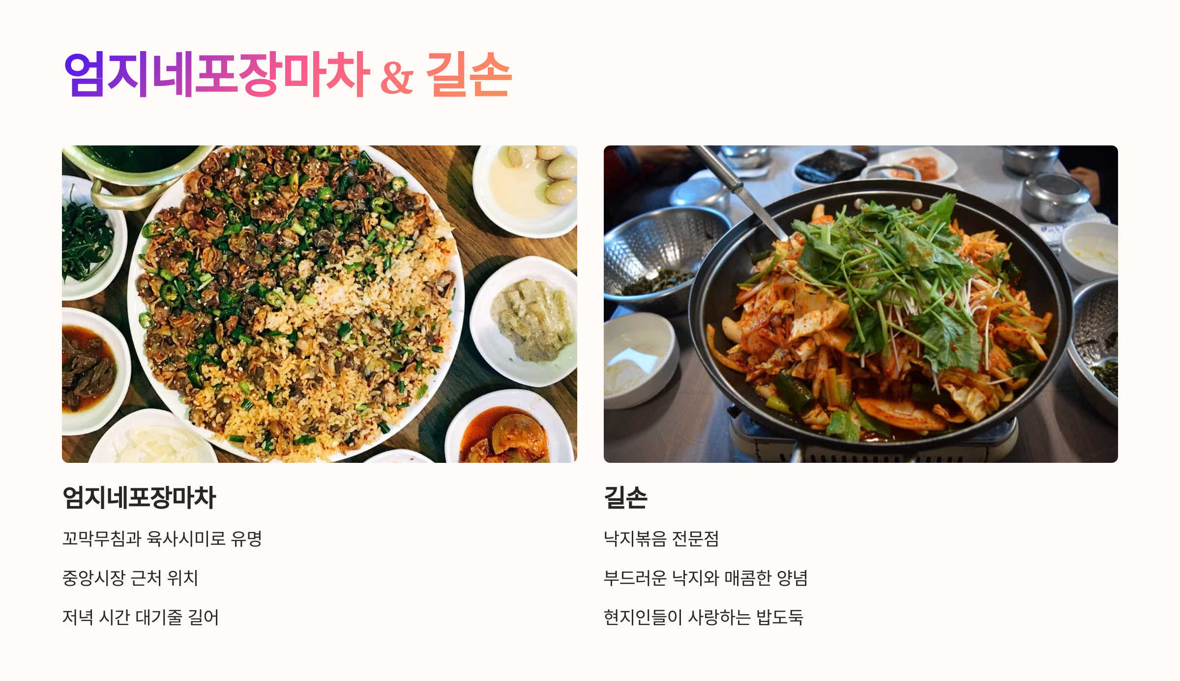 강릉 중앙시장 근처에 위치한 '엄지네포장마차'는 꼬막무침과 육사시미로 유명한 곳입니다. 신선한 재료와 특유의 양념으로 많은 사람들의 입맛을 사로잡고 있어요. 저녁 시간대에는 대기줄이 길 수 있으니 참고하세요.